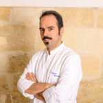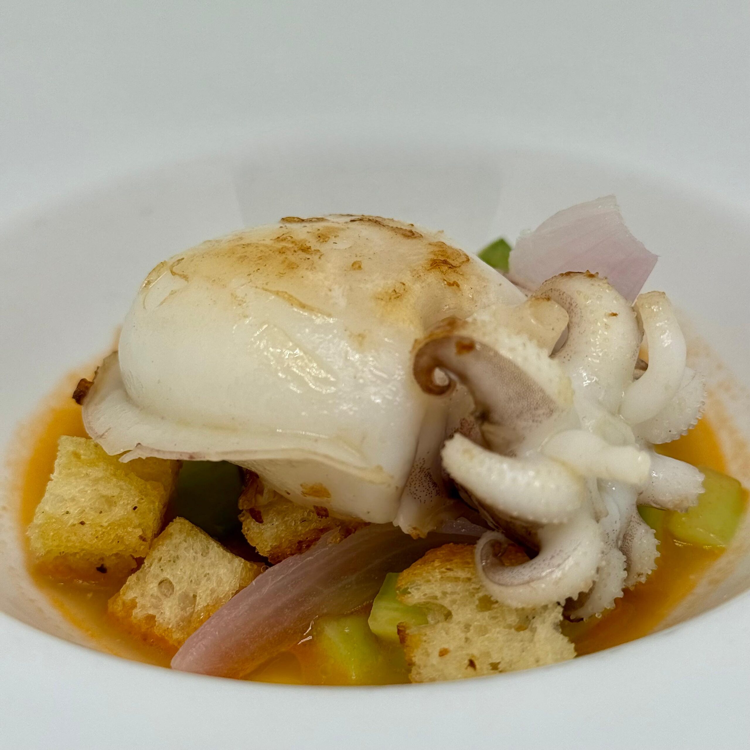 Assemblare il piatto disponendo alla base la panzanella, la seppia grigliata e infine aggiungere la bisque di scampi.