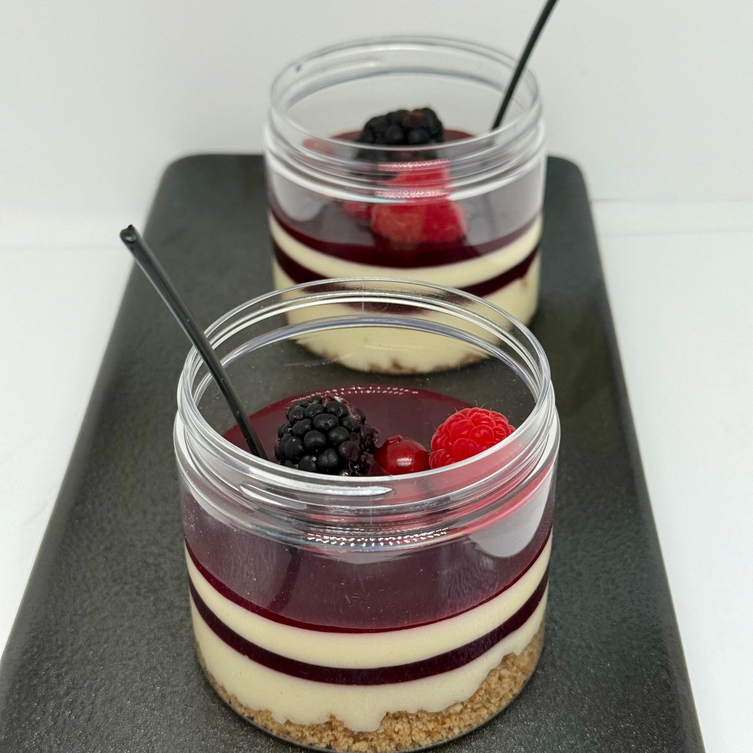 In uno stampo formare la base con i biscotti digestive precedentemente sbriciolati e idratati con burro sciolto fino ad ottenere una consistenza sabbiosa ma legata, far raffreddare in frigo per qualche minuto. Aggiungere la cream a cheesecake fino a metà stampo e far raffreddare il tutto. Inserire la gelee, raffreddare, inserire nuovamente la crema e chiudere con la gelee, lasciar raffreddare per un giorno e servire a piacere.