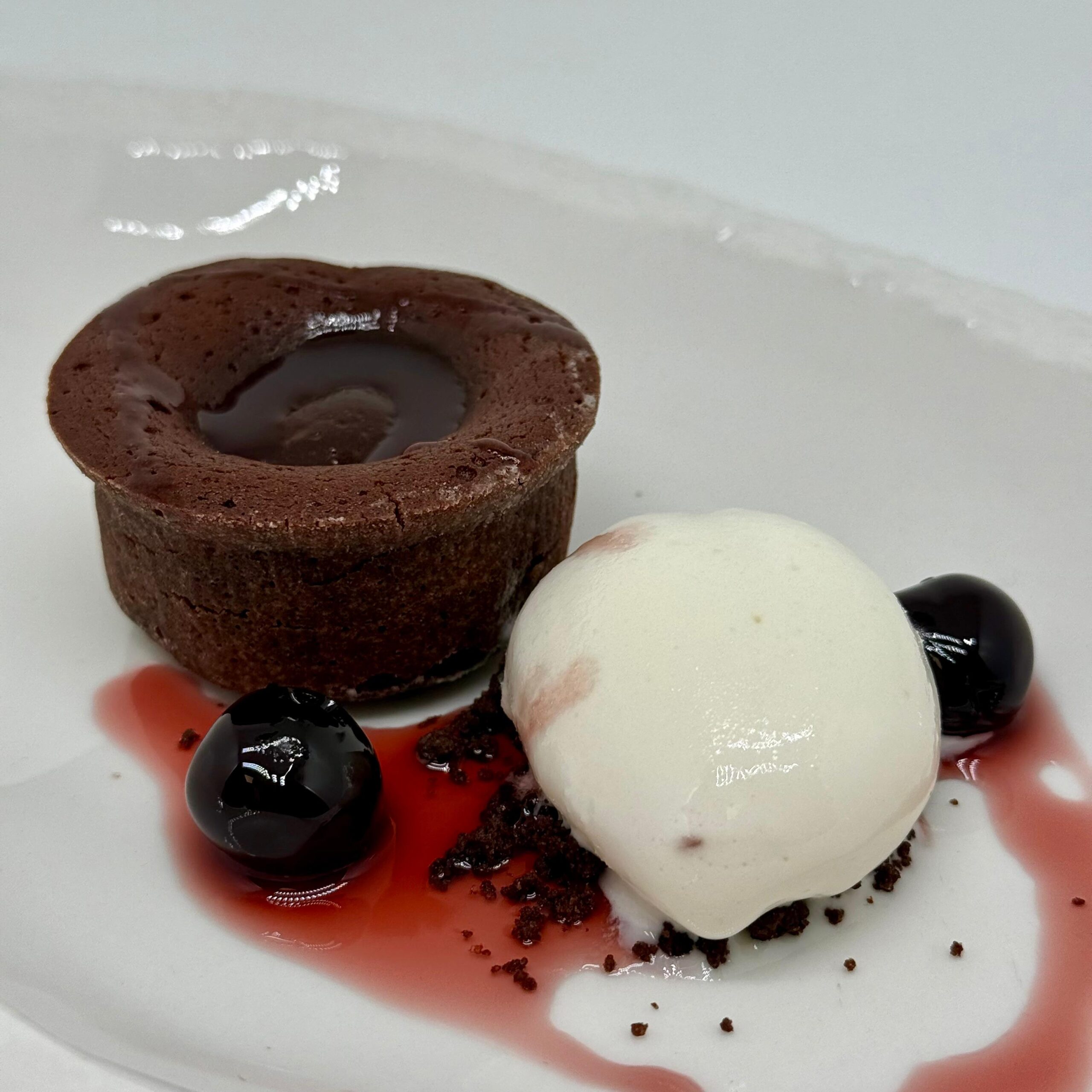 Sformare il tortino e servirlo con una pallina di gelato e completare con delle amarene